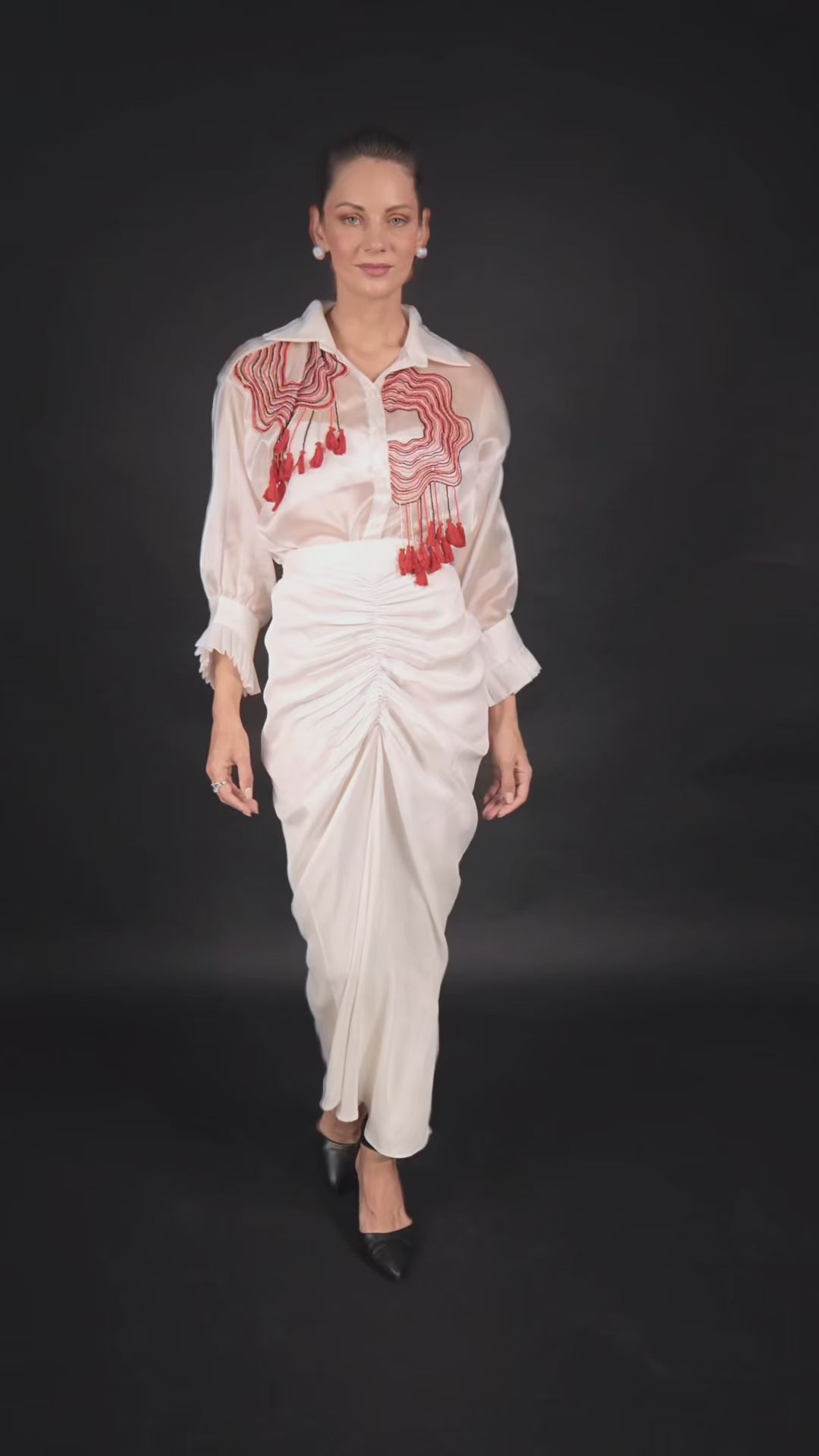 Paired with a modal satin ruched skirt, the ensemble drapes fluidly along the form — creating a silhouette that is both powerful and effortlessly feminine. Each detail, from the tactile embroidery to the flowing structure, reflects the artistry of refined simplicity.